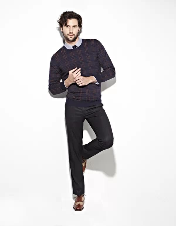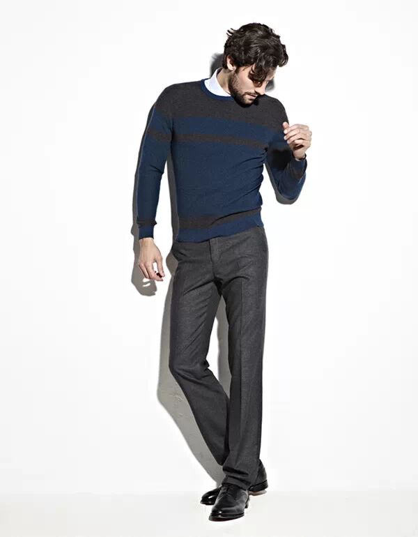 将衬衫下摆扎于裤子内,再套上毛衣的穿法,能展现整齐利落、精练正式的一面,对于身材比例不甚理想的人,也较能塑造出“上身短,下身长”的好比例。